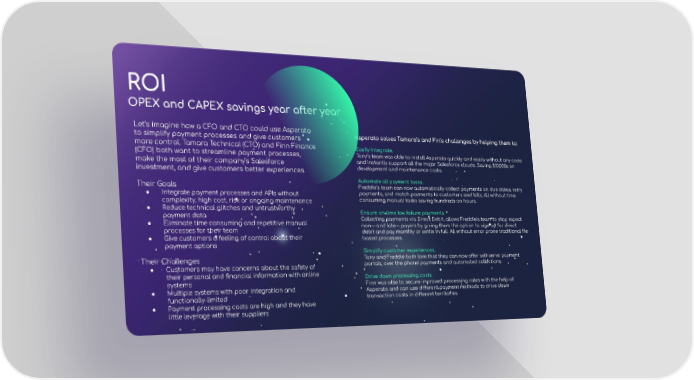 ROI OPEX and CAPEX savings year after year Let’s imagine how a CFO and CTO could use Asperato Asperato solves Tamara’s and Fin’s challenges by helping them to: to simplify payment processes and give customers more control. Tamara Technical (CTO) and Finn Finance Easily Integrate. Tony’s team was able to install Asperato quickly and easily without any code (CFO) both want to streamline payment processes, and instantly support all the major Salesforce clouds. Saving $10,000s on make the most of their company’s Salesforce development and maintenance costs. investment, and give customers better experiences. Automate all payment tasks. Freddie’s team can now automatically collect payments on due dates, retry Their Goals payments, and match payments to customers and bills. All without time ● Integrate payment processes and APIs without consuming manual tasks saving hundreds on hours. complexity, high cost, risk or ongoing maintenance ● Reduce technical glitches and untrustworthy Ensure on-time low failure payments. payment data Collecting payments via Direct Debit, allows Freddie’s team to stop repeat ● Eliminate time consuming and repetitive manual non— and late— payers by giving them the option to sign up for direct processes for their team debit and pay monthly or settle in full. All without error prone traditional file ● Give customers a feeling of control about their based processes. payment options Simplify customer experiences. Tony and Freddie both love that they can now o昀昀er self-serve payment Their Challenges portals, over the phone payments and automated collections. ● Customers may have concerns about the safety of their personal and financial information with online Drive down processing costs systems Finn was able to secure improved processing rates with the help of ● Multiple systems with poor integration and Asperato and can use di昀昀erent payment methods to drive down functionally-limited transaction costs in di昀昀erent territories. ● Payment processing costs are high and they have little leverage with their suppliers