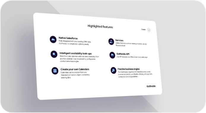 Highlighted features Create Native Salesforce Services Fully integrated with your existing CRM data, Define Services, such as catering or extra’s, on any GoMeddo is completely Lightning ready Resource level GoMeddo API Intelligent availability look-ups Our API exposes your Resources to any web page Work from one calendar with real-time availability from another calendar. Use the powerful, configurable conflict detection engine Create your own Calendars Flexible business engine Calendars can be created from any Turn GoMeddo together with Salesforce into a solid Standard or Custom object, containing business engine for your flexible offering, with payment, existing data connection and UX possibilities