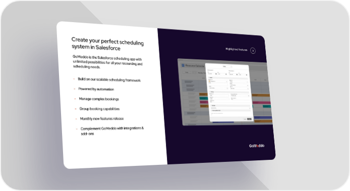 Highlighted features Create your perfect scheduling system in Salesforce GoMeddo is the Salesforce scheduling app with unlimited possibilities for all your resourcing and scheduling needs. - Build on our scalable scheduling framework - Powered by automation - Manage complex bookings - Group booking capabilities - Monthly new features release - Complement GoMeddo with integrations & add-ons