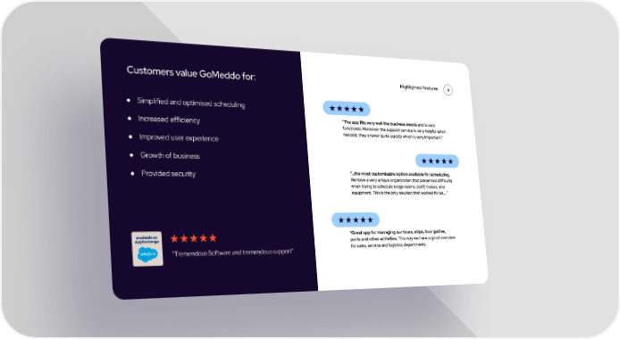 Highlighted features Customers value GoMeddo for: ● Simplified and optimised scheduling “The app fits very well the business needs and is very ● Increased efficiency functional. Moreover the support service is very helpful when needed, they answer quite quickly which is very important!” ● Improved user experience ● Growth of business “...the most customizable option available for scheduling. ● Provided security We have a very unique organization that presented difficulty when trying to schedule lodge rooms, staff, horses, and equipment. This is the only solution that worked for us,...” “Great app for managing our tours, ships, tour guides, ports and other activities. This way we have a good overview for sales, service and logistics departments. “Tremendous Software and tremendous support”