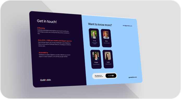 [email protected] Get in touch! Want to know more? Efficiency GoMeddo developers and engineers are known for effective technological advice and the way that they put our customers first Chris Rico Only €33,- / $35 per month with Expert service Senior Account Account Executive From €33 per month, we activate GoMeddo in your Salesforce Director Org to access all the GoMeddo features, including our premium success plan. Accessibility GoMeddo is a native Salesforce solution. Whether you are an expert or never heard of it, we can help you get started Lucie Moritz Account Executive Account Executive We welcome you to the new name of gomeddo.com