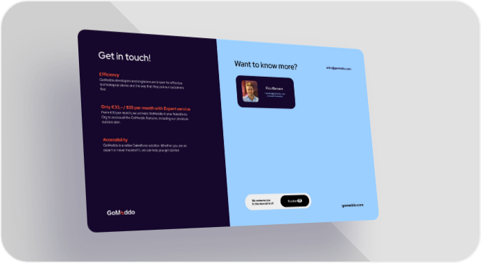 [email protected] Get in touch! Want to know more? Efficiency GoMeddo developers and engineers are known for effective Rico Ramars technological advice and the way that they put our customers [email protected] first Account Executive Only €33,- / $35 per month with Expert service From €33 per month, we activate GoMeddo in your Salesforce Org to access all the GoMeddo features, including our premium success plan. Accessibility GoMeddo is a native Salesforce solution. Whether you are an expert or never heard of it, we can help you get started We welcome you to the new name of gomeddo.com