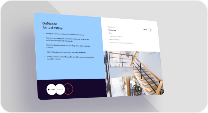Education Retail GoMeddo Real estate for real estate Retail - Manage an unlimited number of locations in one overview Hospitality & leisure Health & fitness - Report on occupancy rates, availability and popular locations with out-of-the-box Reports & Dashboards Automotive & resource management - User-friendly, customisable click and drag, colour-coded calendar interface - Connect bookings, clients, contacts and billing effortlessly - Use the Floorplan add-on to visualize any office or event space and see availability instantly