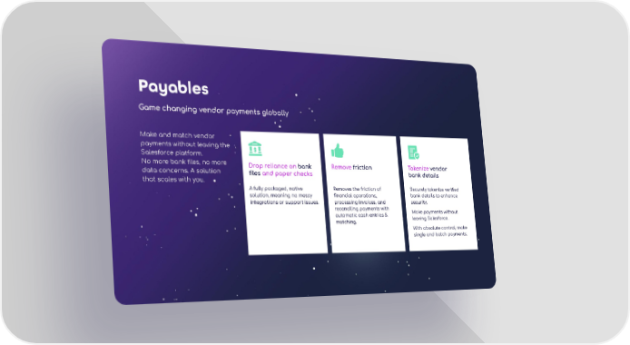 Game changing vendor payments globally Make and match vendor payments without leaving the Salesforce platform. No more bank files, no more Drop reliance on bank Remove friction Tokenize vendor data concerns. A solution files and paper checks bank details that scales with you. A fully packaged, native Removes the friction of Securely tokenize verified solution, meaning no messy financial operations, bank details to enhance integrations or support issues. processing invoices, and security. reconciling payments with Make payments without automatic cash entries & leaving Salesforce. matching. With absolute control, make single and batch payments.