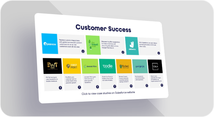 With Salesforce, we can reduce Replace custom integrations Empowering 15k+ supporters manual processes and break with global automated payment to make one-time and down silos. collections to serve new recurring donations for a customers every 30-minutes hunger free future EW Technologies FirstPort puts Jurassic Fibre goes Oodle Car Finance Rutland County Building homes CALA Homes uses Salesforce to customer service from start-up to blazes a trail in the Council improves and relationships, unleashes the magic of Salesforce on double revenues at the heart of its scale-up with car loans industry customer service with Salesforce plans for growth Salesforce during COVID-19 buyers across the UK Click to view case studies on Salesforce website