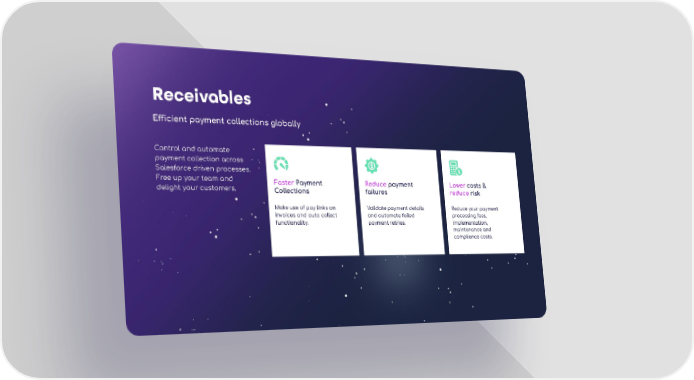 E昀케cient payment collections globally Control and automate payment collection across Salesforce driven processes. Free up your team and Faster Payment Reduce payment Lower costs & delight your customers. Collections failures reduce risk Make use of pay links on Validate payment details Reduce your payment invoices and auto collect and automate failed processing fees, functionality. payment retries. implementation, maintenance and compliance costs.
